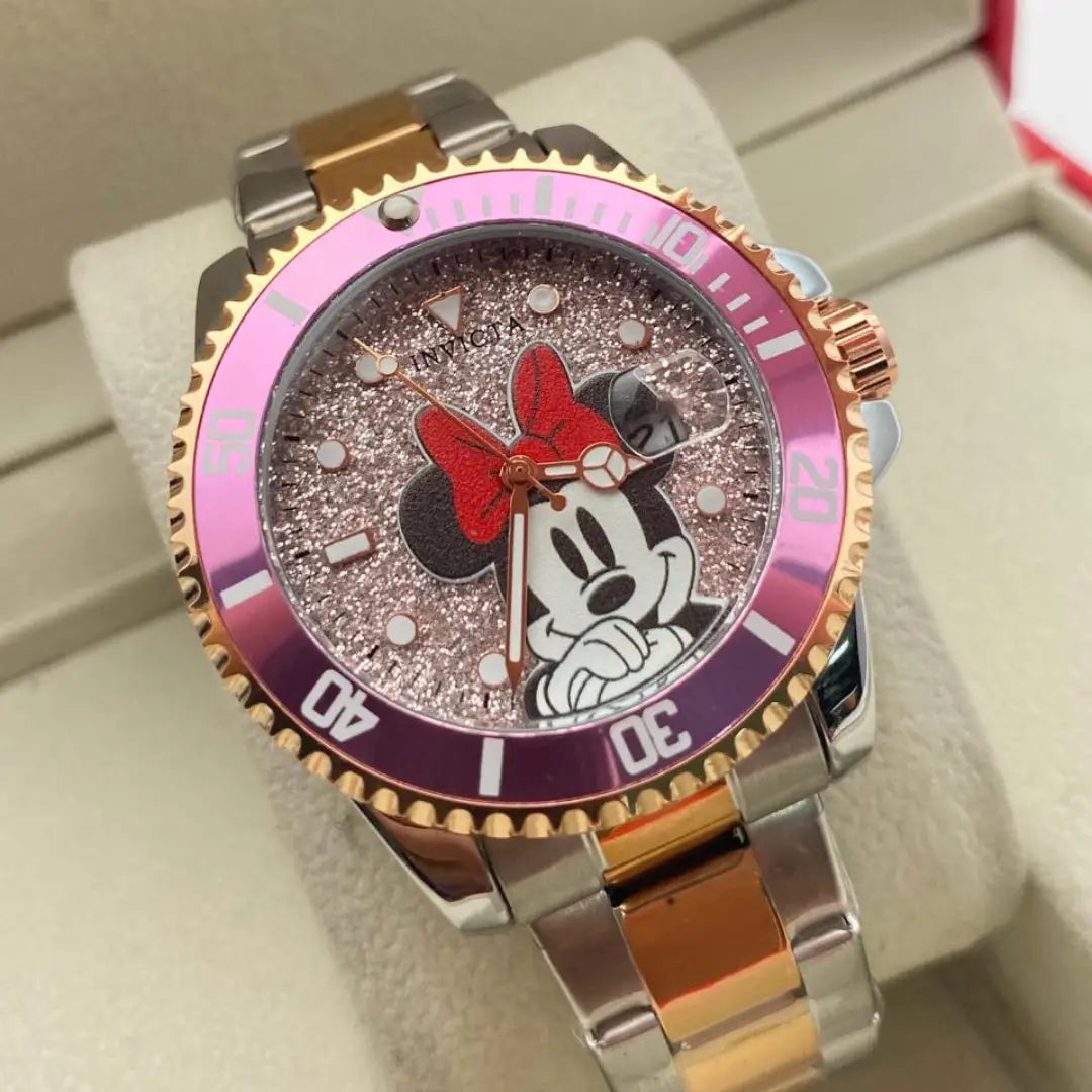 Este reloj combina un estilo femenino, elegante y moderno, con un diseño inspirado en Minnie, ideal para quienes buscan un accesorio llamativo que complemente cualquier outfit.